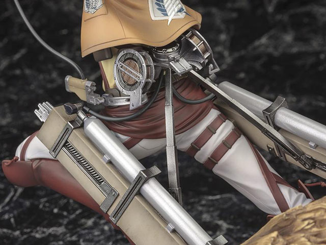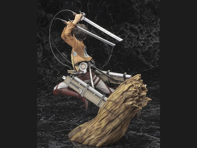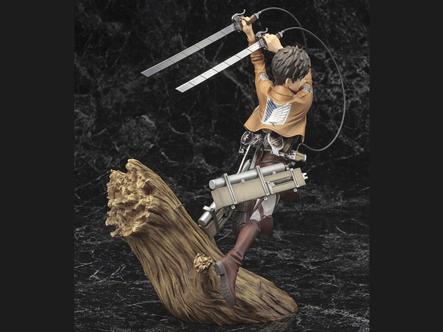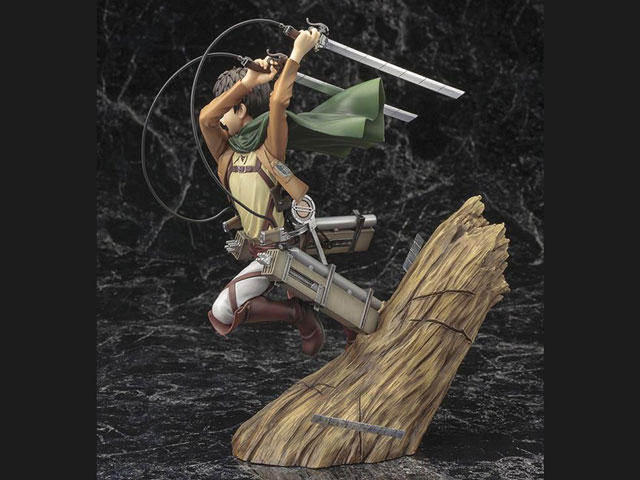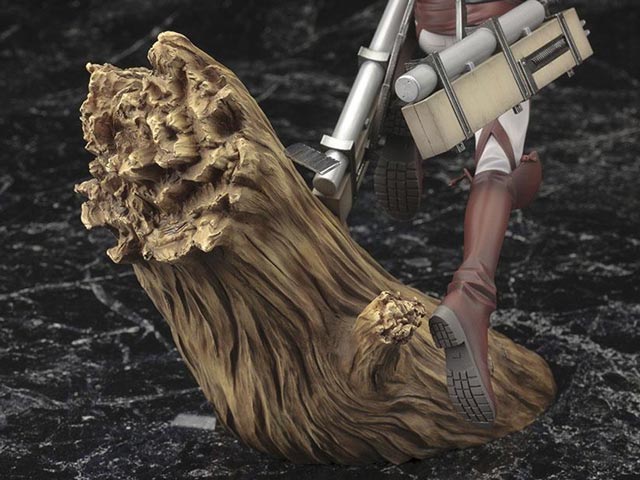 - Details: Features intricate sculpting on the Vertical Maneuvering Equipment, bark patterns on the tree base, and a removable cape for two display options.